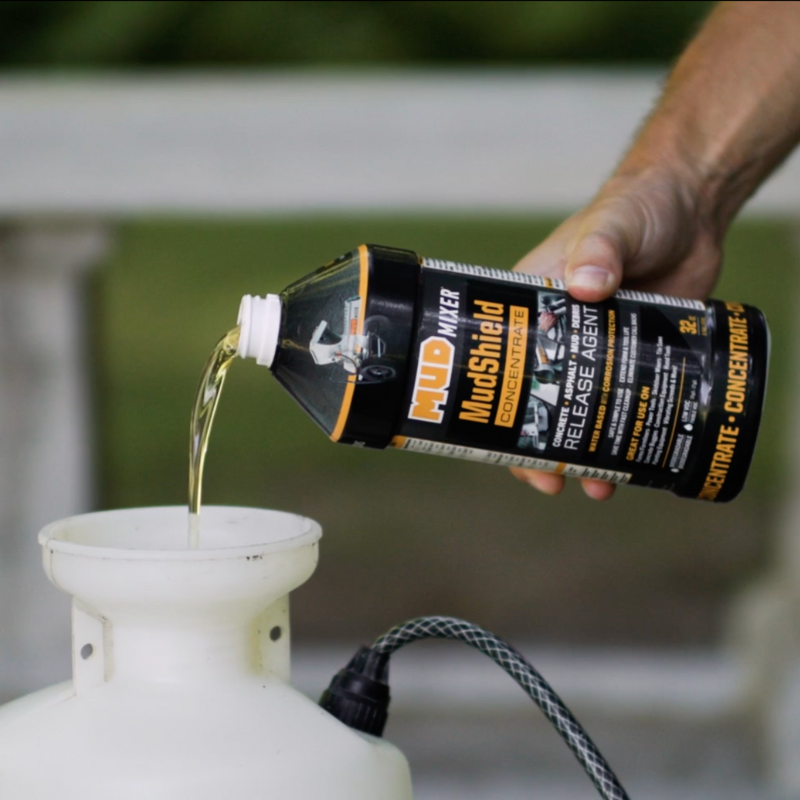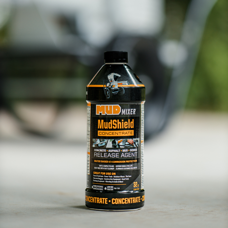 To use MudShield with a MudMixer, lightly mist the chute, guards, and exterior metal surfaces before mixing. After the pour, residue rinses off faster, and the metal is protected for the next use.